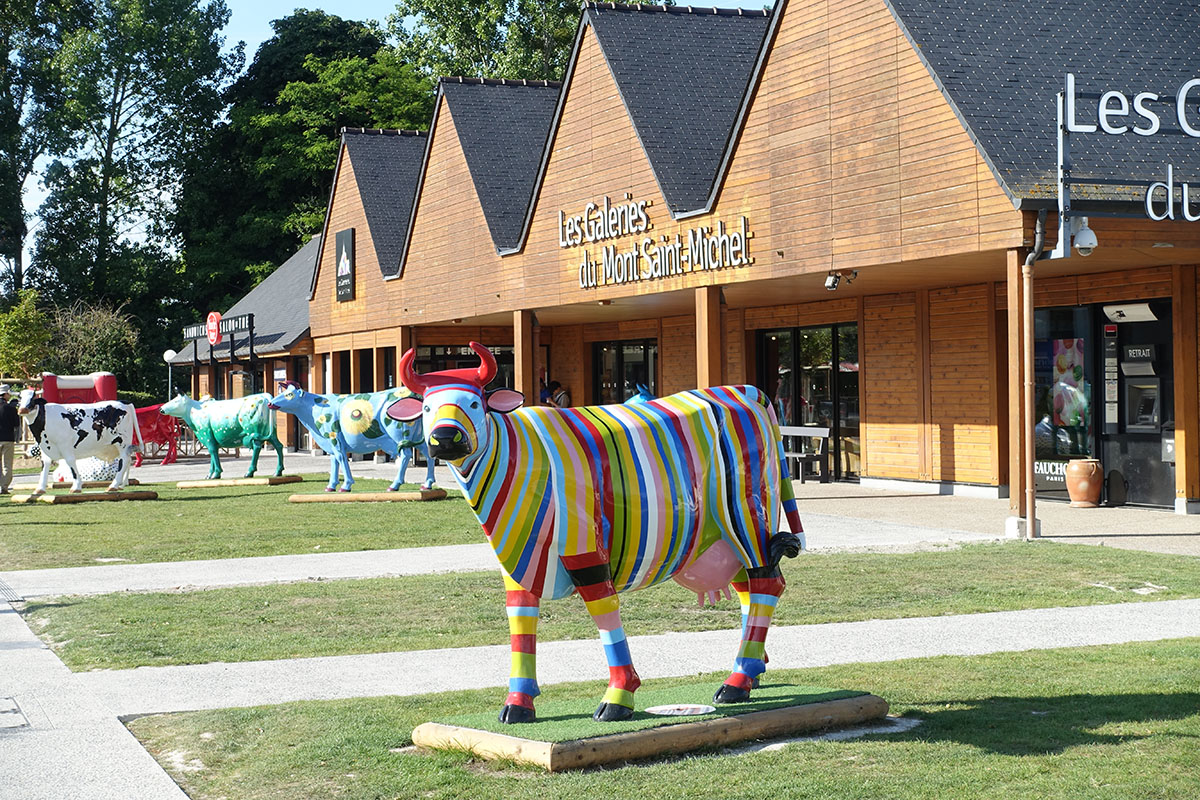 先ず、お店の前の牛の色がいかにもフランス的で目に止まります。お店の中はお土産やら衣類やら食品やらいろいろありました。パンコーナーでは簡単に食事もできるようでした。モンサンミッシェルで宿泊するなら、ここでおやつ(あるいは夜食)や飲料水を調達することができます。