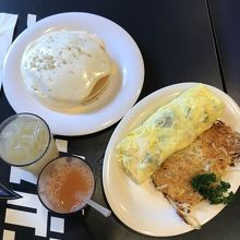オーダーはパンケーキとほうれん草とマッシュルームのオムレツ。どっちもいい味!!パンケーキは優しい甘味でペロリと食べられるし、オムレツはいい塩加減で野菜たっぷり。付け合わせのハッシュポテトも美味しかったです。