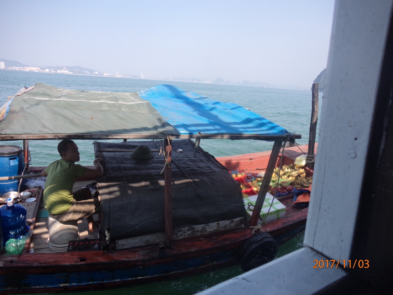 ハノイからバスで3時間30分はかかるハロン湾で昼食をしながらクルーズをしようというのがこの小旅行の目的である。ランチは海鮮のベトナム料理だ。途中水上生活者が自分たちでとった貝や魚を乗ってクルーズ船に乗ってくる。それを買うと船のスタッフが調理してくれるというようになっている。またフルーツを売ろうと近づいてくる舟もある。