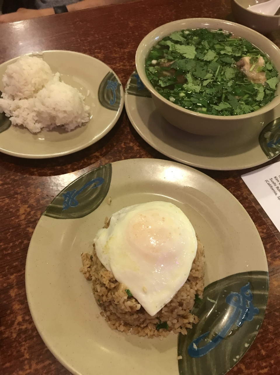 オックステールスープのレギュラーサイズとフライドライスを頼んで大人2人こども1人でシェアしようとしましたが、パクチーたっぷりのスープとお肉のホロホロ加減、生姜醤油のアクセントもあってスープが足りずミニを追加注文しました。しかしどちらにもごはんが2スクープついてくるので、後から後悔しました。。。