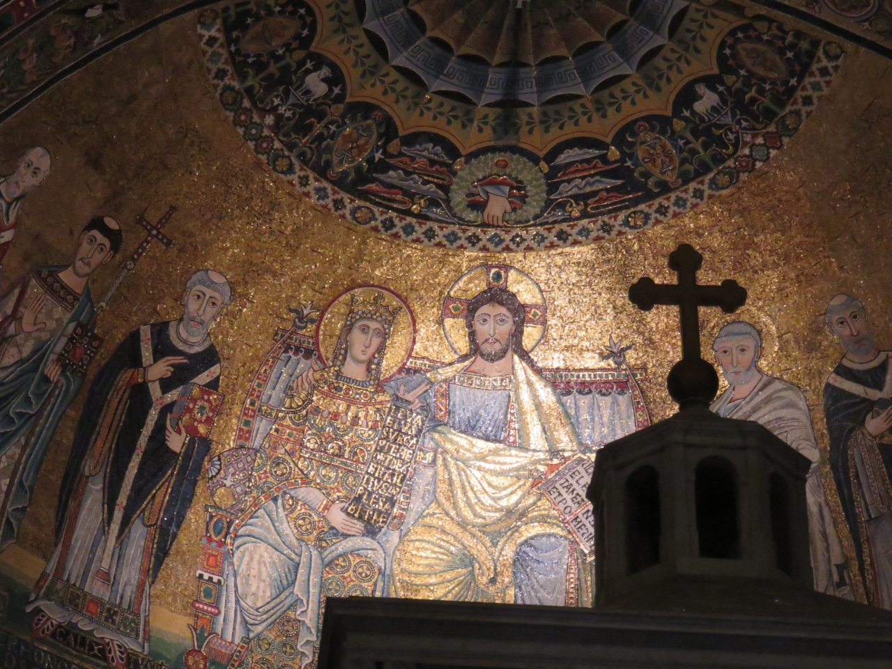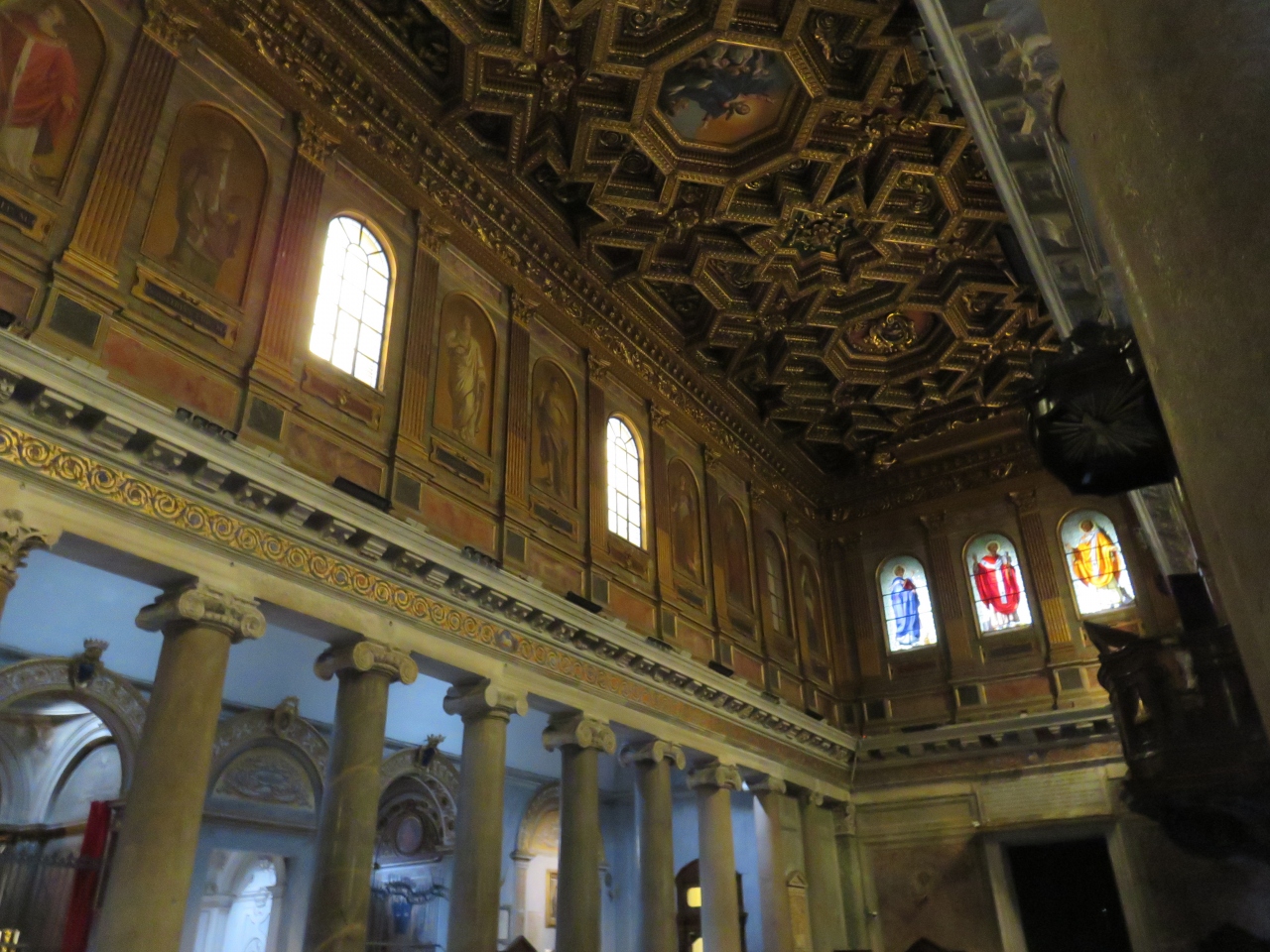 ローマ初の聖母マリアに捧げるための教会として造られ、その後もたびたび改修され、12世紀半ばに今も残るロマネスク様式の聖堂となったようです。聖堂の内部は、3身廊のバジリカ様式で造られていて、16世紀初頭に改修された金箔で彩られた華麗な格天井には、ドメニキーノの「聖母被昇天」の絵が描かれていました。豪華な天井やモザイクが奇麗で見とれてしまいました。