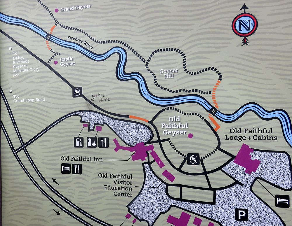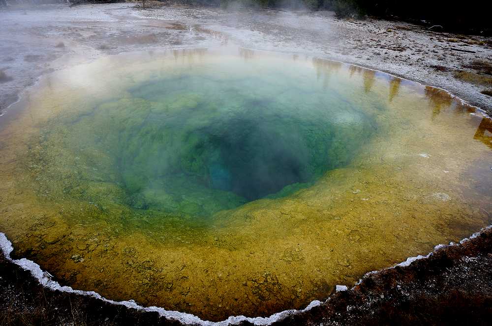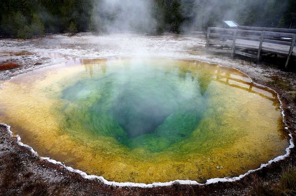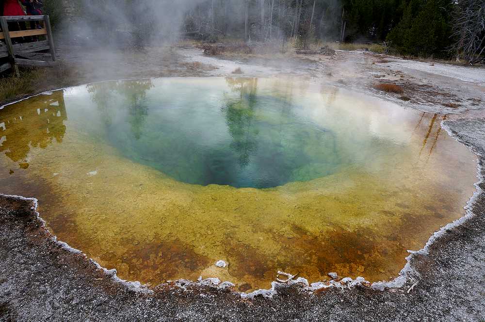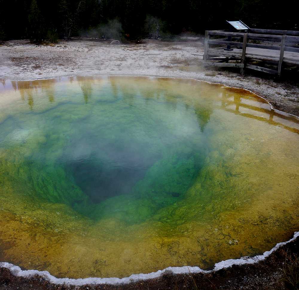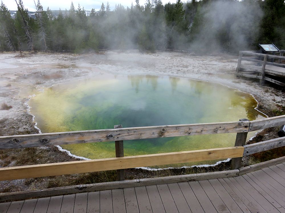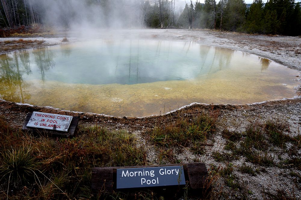 イエローストーン国立公園で唯一知っていたのが、このプール。黄色と青の強烈な色は一度見たら忘れられません。私達は、オールドフェイスフルに着くと、真っ先にモーニンググローリーに向かいました。オールドフェイスフルインを背にして左(西)へ伸びている道を歩き続けると、40分ほどで一番奥にあるこのプールに着きました。途中にはキャッスルガイザーやcrested poolなどの見どころもありました。朝早かったせいか、私たちの他に数人の人が見学しているだけだったので、色々な角度からプールの撮影ができました。想像していた以上に鮮やかな色で、中央の穴へ吸い込まれそうな感覚を覚えました。すぐに中国人の観光客に展望テラスが占領されたので、早く来てよかったと思いました。オールドフェイスフルには、他にも多くの見どころがありますが、ここだけでも来た甲斐があると思えるような素晴らしいプールなので、オールドフェイスフルに来たら、是非ここだけは見逃さないように。