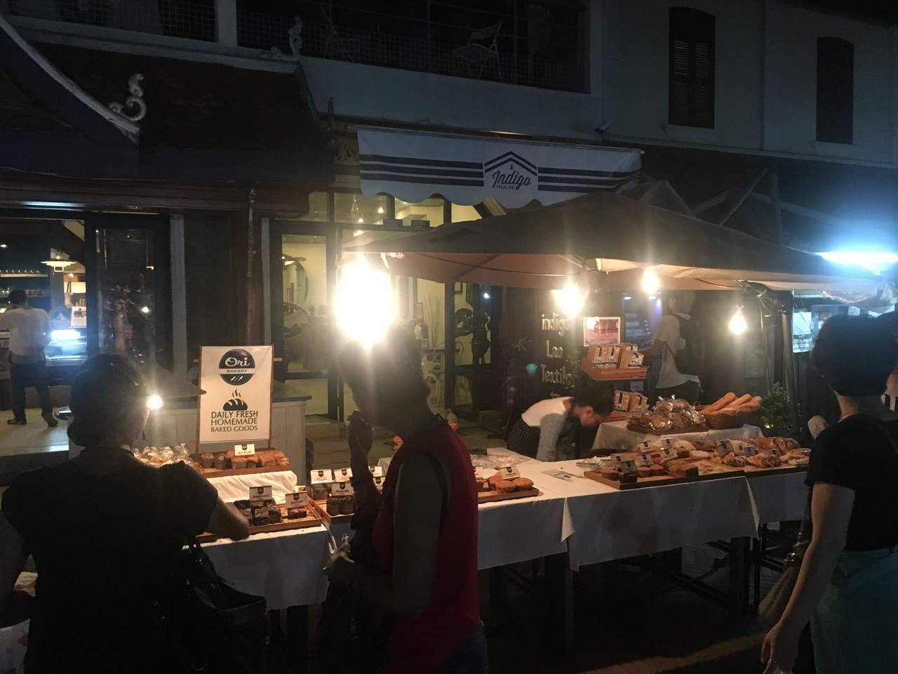 夕方になるとワットマイ前のメイン通りが歩行者天国になり、びっちりとテントが並びます。メインはお土産の品々で品揃えはどこも変わりませんが空港にも大したお店は無いのでここで楽しく調達するのが良さそう。プーシーの丘から向かってワットマイの先にはフードテントが並ぶ横道もあって、東南アジアっぽい屋台ごはんも楽しめます。夜の予定では外せない楽しい場所でした。