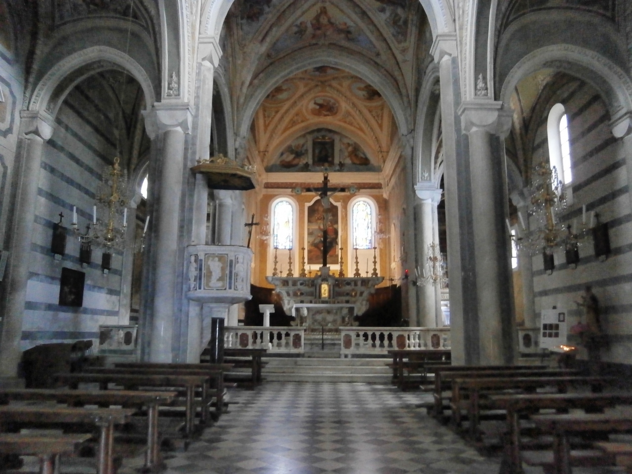 外壁は武骨な石造りで一見地味な外観ですが、中へ入るとガラリと印象が変わります。狭い室内いっぱいに多くの宗教画が飾られ、大理石の柱で支えられた天井のフレスコ画も見事なものでした。小さいけれど見ごたえのある教会です。