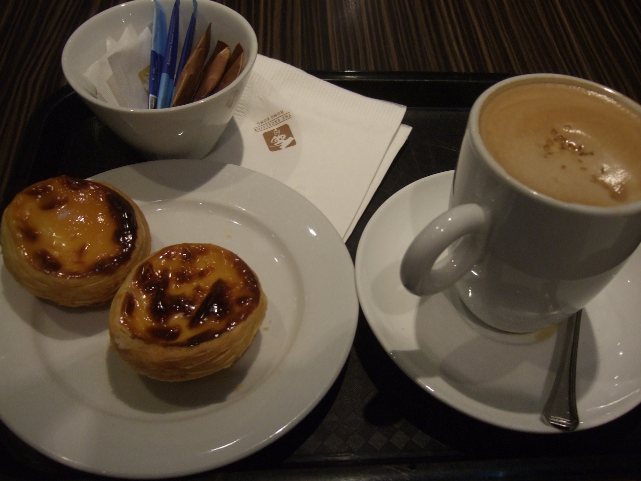 エクセルシオール香港の中にあるカフェです。マカオのエッグタルトが香港で食べられます。ばら売りもありますが、4個以上買うと安くなります。エッグタルト2個とコーヒーのセット(50ドル)を注文しました。コーヒーはいろんな種類があって、選べます。去年はカプチーノにしたのですが、ラテアートしてくれました。今年はカフェオレにしました。