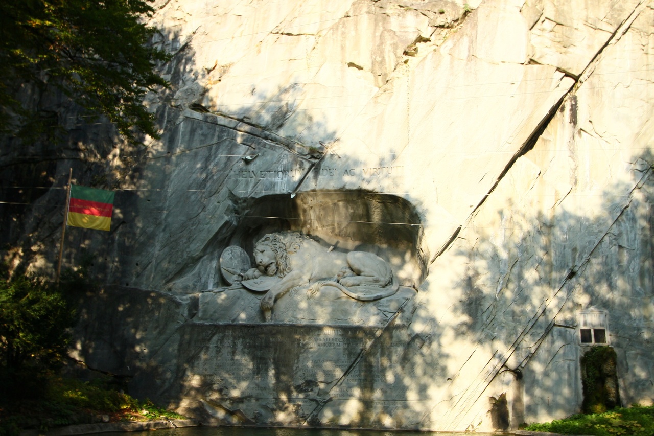 池の奥には砂岩の岩壁に掘られた「瀕死のライオン像」この像はフランス革命の際に、隣国のために戦ったスイスの傭兵達の慰霊碑です。