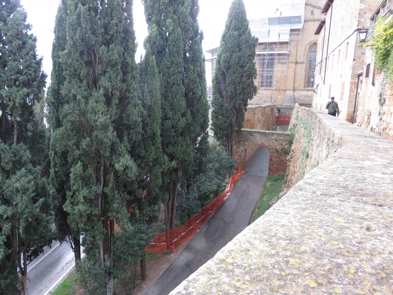 トスカーナの雄大なパノラマを見晴らせる小高い丘の頂上に建てられた、とても小さな町ですが、城壁に囲まれた町でもあるようです。この通りは、町の外周を通っているように感じられ、外部からの侵入や侵略を防御する前線のようにも感じられました。