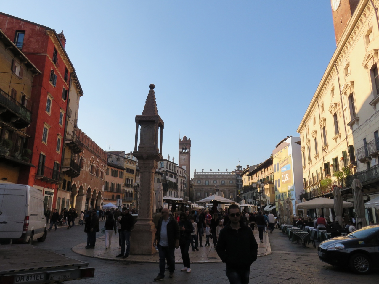 ヴェローナ旧市街中心にある広場で、シニョーリ広場と共に古代ローマ時代に造られた公共広場です。農産物を売る露天市場の中心であったため、代表的な商品であるハーブに因んでハーブ広場(=エルベ広場)と名付けられたようです。歴史的な建物に囲まれていて、出店よりも建物の壁に描かれたフレスコ画が印象的でした。
