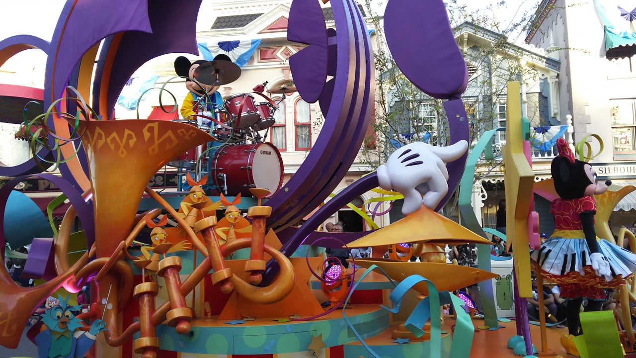 ミッキーやその仲間たちが音楽にあわせて踊ったり盛り上げてくれたりするカリフォルニアのディズニーランドのかわいいパレードです。