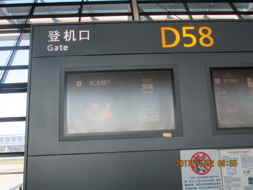 びやっと荷物受取の指定されたターンテーブルに到着、そこには乗って来た飛行機の便名の他に違う飛行機の便名が表示されています。ターンテーブルの順番待ちです。前の荷物が片付くまで30分、やっと自分達の番です。今まで1時間程でターミナルから出られた物が倍の2時間程掛かってしまいます。出国もチェックイン、荷物検査で2時間前でもぎりぎりでした。今回の春秋航空は沖止めでなく搭乗橋のある場所に停泊いたしましたので少しは短縮されました。第2ターミナルをご利用の方はご注意ください。