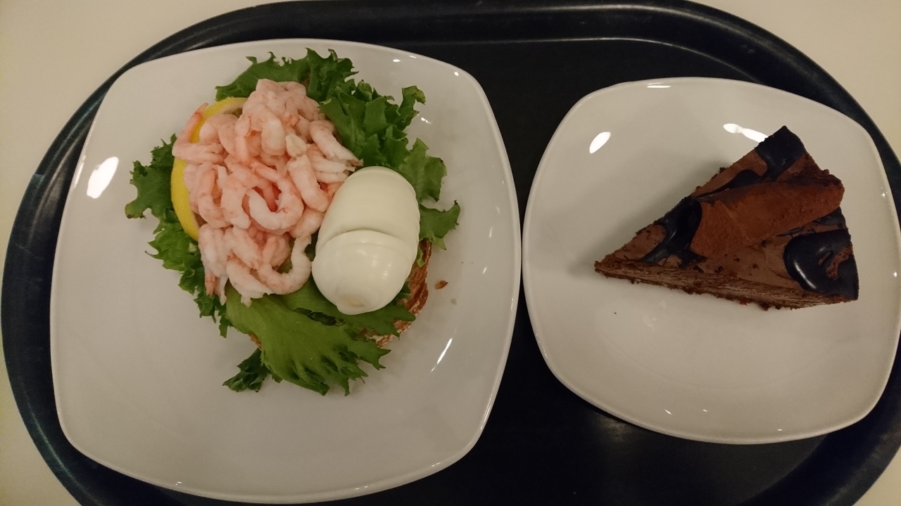チョコレートケーキとシュリンプオープンサンド、コーヒーを注文