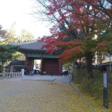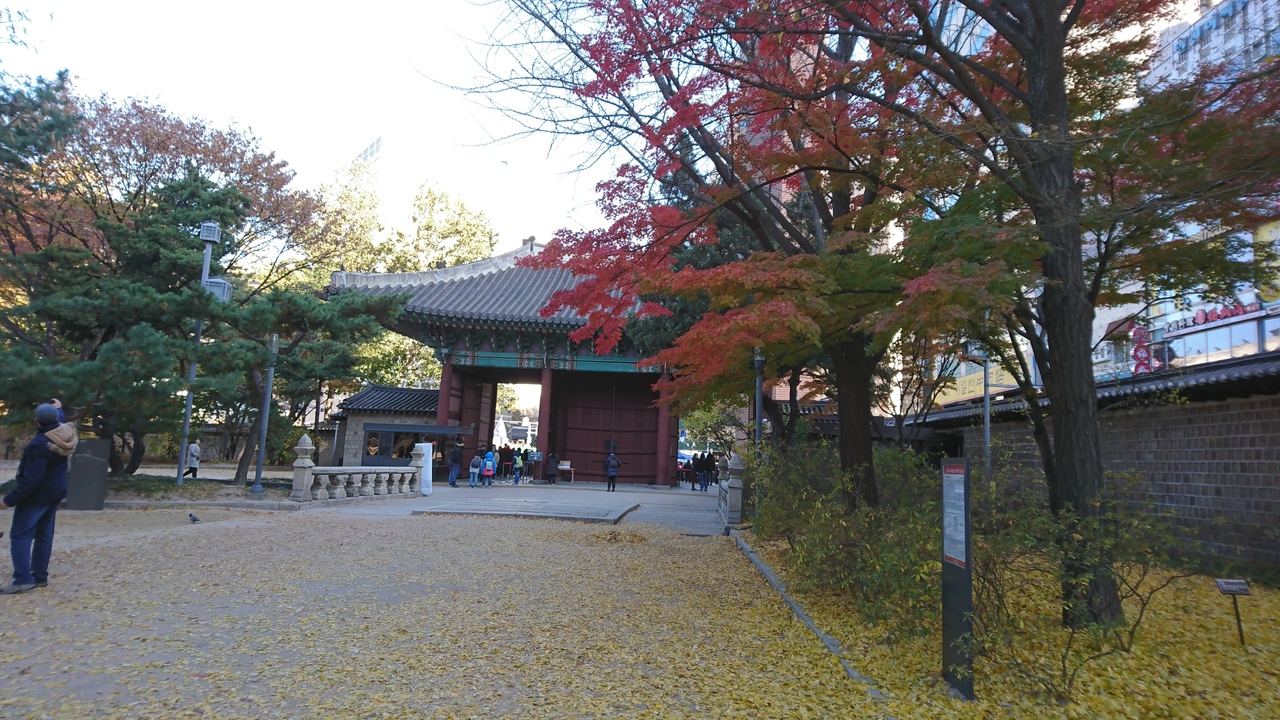 徳寿宮の入口の門でここから入場料を払って入ります。入口の側でデモが行われていてすごく騒がししかったです。そのせいかはこの門の側で行われるらしい衛兵交代もやっていなくて残念でしたませんでした。入口を入ると紅葉しており落ち葉も落ちていていい景色なので紅葉の季節に行くのがおすすめです。