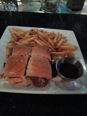 一番人気のメニューをチョイスしたら、いかにもステーキ、と言ったディッシュではなく、ゴージャスなハンバーガーが来ました。あー、こんなんか。と思いきや、肉厚のステーキが贅沢にもサンドされ、絶品ソースに浸しながら頂きました。