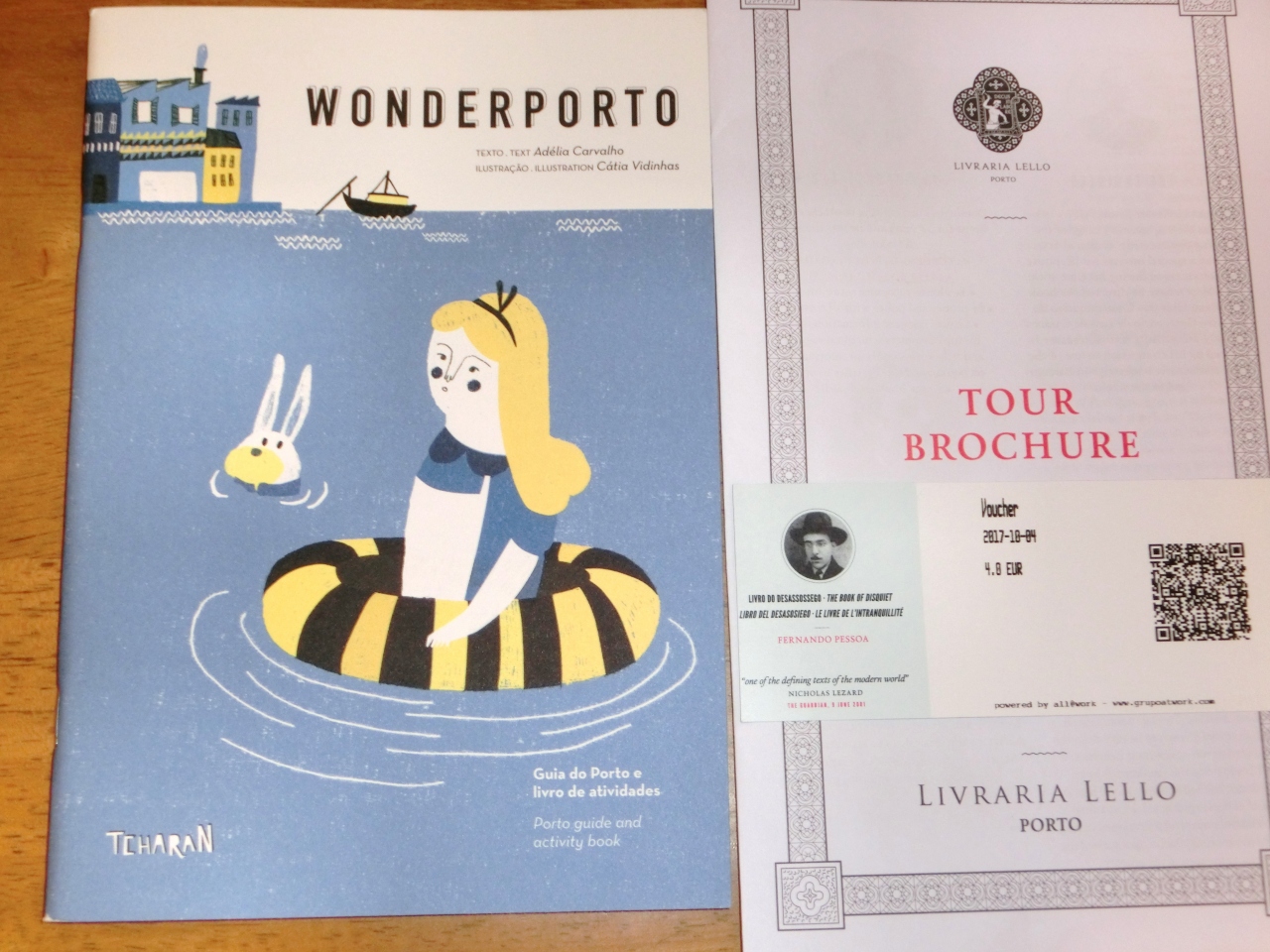 入場券は4ユーロの金券となるので、小さめの軽い本を物色。観光客のために作成した書店を紹介する写真入りの薄い冊子が一番手頃ではないかと思われます。アリスが不思議の町ポルトを冒険するという趣向の薄い絵本を見つけたので、アリスコレクションの1冊として購入しました。レジの状況では、店内の観光客で本を買っている人はほとんどいないようでした。よって入場料取るシステムも仕方がないことなのでしょう。