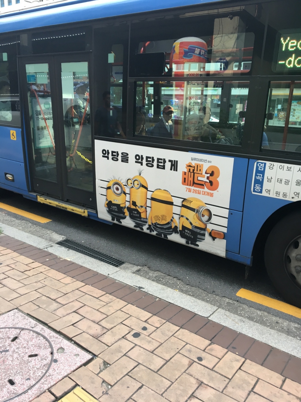 今回の旅行は、GoogleMAPを使ってたくさんバスに乗りました。ちょうどミニオンの映画をやっている時期だったので、ミニオンのバスが走っていて子供が喜んでいました。バスは乗車時に運賃を支払うんですが、乗るたびに小銭を用意するのは大変なので、Tマネーカードを用意されることをオススメします。