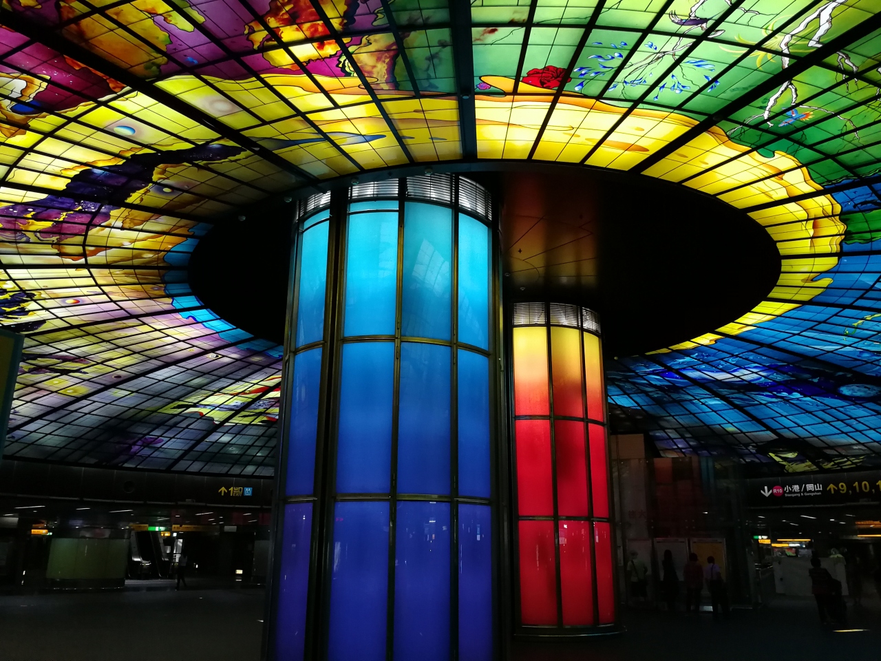 駅の名前に同じに、異なる色の光で非常に芸術的な駅です。その有名な駅に他の観光客が柱の背景に写真を撮るように頼まれていました。では赤線とオレンジ線の転送は少し複雑で、歩行が必要ですが、その点に少し不便です。