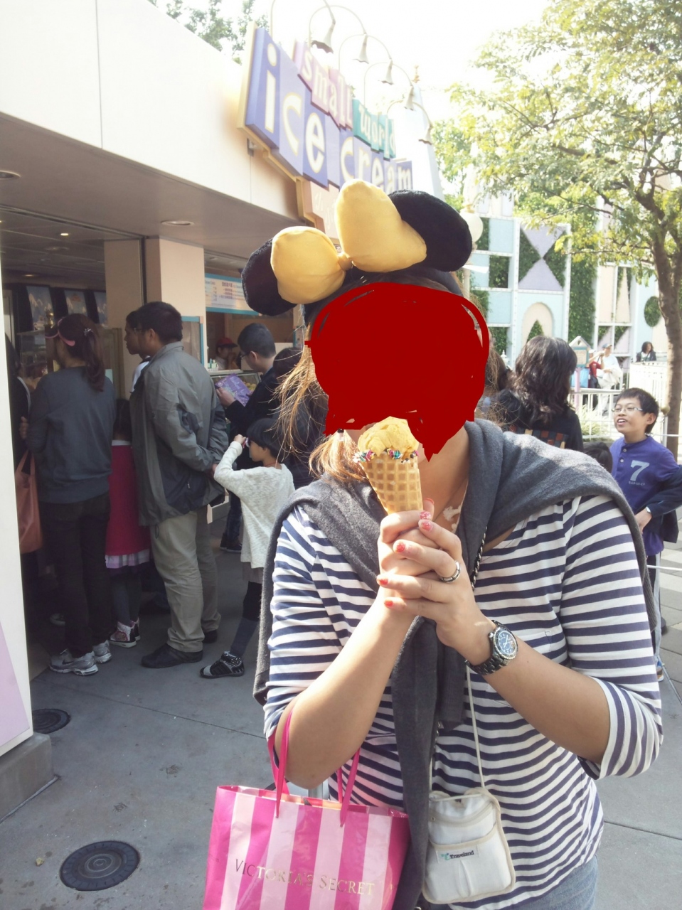 イッツアスモールワールドもこちらのエリアで人気のアトラクションで、日本とは違うルートで楽しむことができます。イッツアスモールワールドの近くにはおいしいアイスクリーム屋さんも。コーンにもチョコでデコレーションしてあってかわいい!香港は1月もあたたかい陽気なのでアイスクリーム屋さんもけっこう並んでいます。
