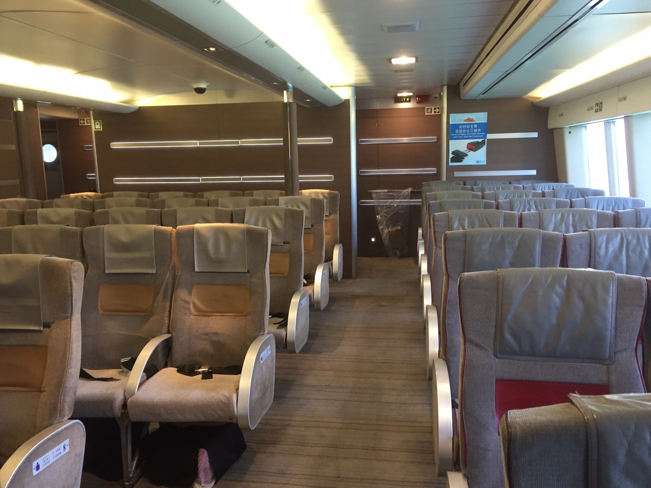 香港からマカオまでを結ぶフェリーは何社かありますが、赤く眩しい船はターボジェットです。行きはエコノミーが空いてなかったのでスーパークラスに乗りました。