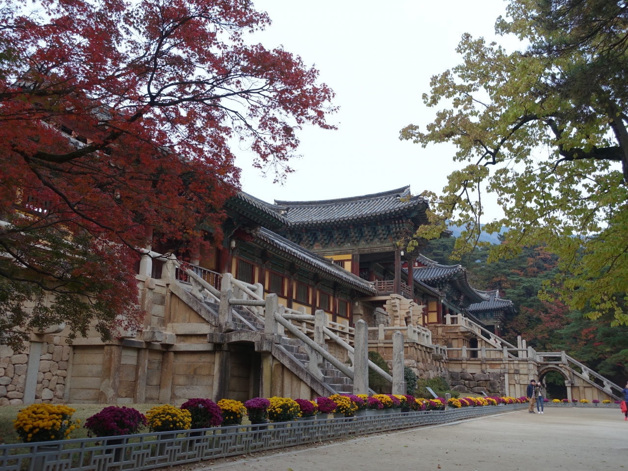 仏国寺の大雄殿に通じる門の一つ、安養門に上がる階段が国宝の蓮華橋、七宝橋です。上の部分が七宝橋、下の部分が、蓮華橋です。蓮華橋の方には、階段上から見ると、蓮華の花が彫られているのがわかります。彼岸の世界に渡る橋として、優雅だと思いました。