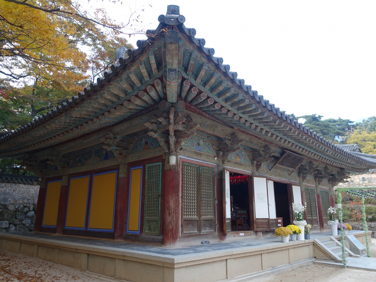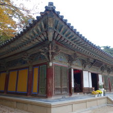無説殿の裏手、階段を上がると、毘盧殿があります。1973年の補修工事の時に復元されたものです。中には、国宝の座像が収められています。太陽の象徴とされている仏様だそうです。隣にある観音殿に行くのには、細い階段を上がって行きます。ここが写真スポットになっていました。