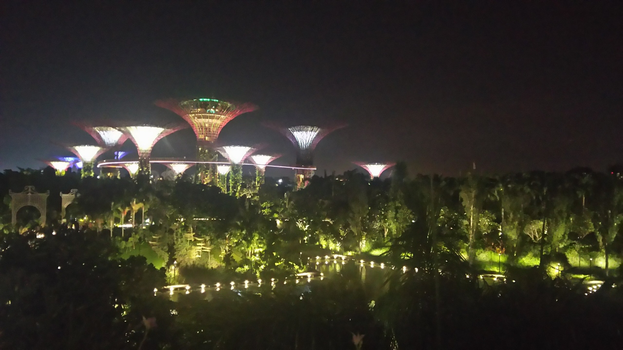マリーナベイサンズを抜けて、広大な緑の中にガーデンバイザデイがあります。昼間に行っても緑がきれいで気持ちいいのですが、夜はライトアップして本当にきれいですね。風も少しあって暑さもましになりますので良いですね。