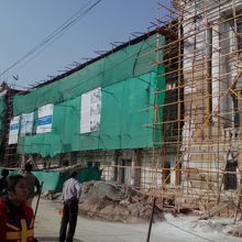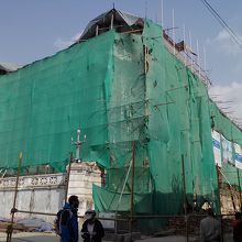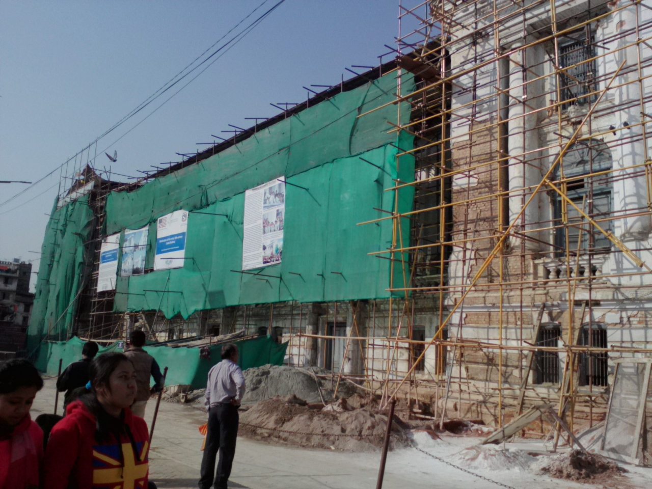3年前に訪れた時はまばゆいばかりの“白亜の宮殿”でしたが2015年に発生した地震の影響でその姿は一変。現在は足場とネットに覆われ完全工事中です。ある意味貴重な姿とも言えなくもありませんが見るべき状態ではありません。同時に崩れた他のネワール様式の寺院よりは修復は容易そうなのでそれまで待ちたいと思います。