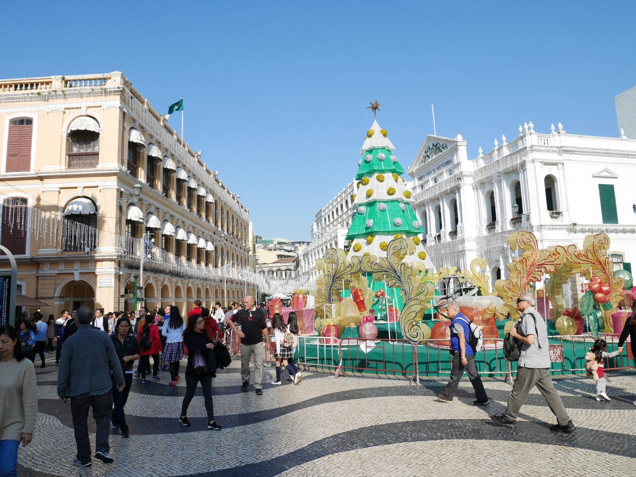世界遺産に登録され、マカオの中心部にある有名な広場です。周辺には沢山の世界遺産やお店が立ち並ぶため、いついっても観光客や地元に人で大混雑しています。道はタイルが貼られ、きらいな模様を描いています。クリスマスが近かったせいか、沢山のライトも飾られいい雰囲気でした。