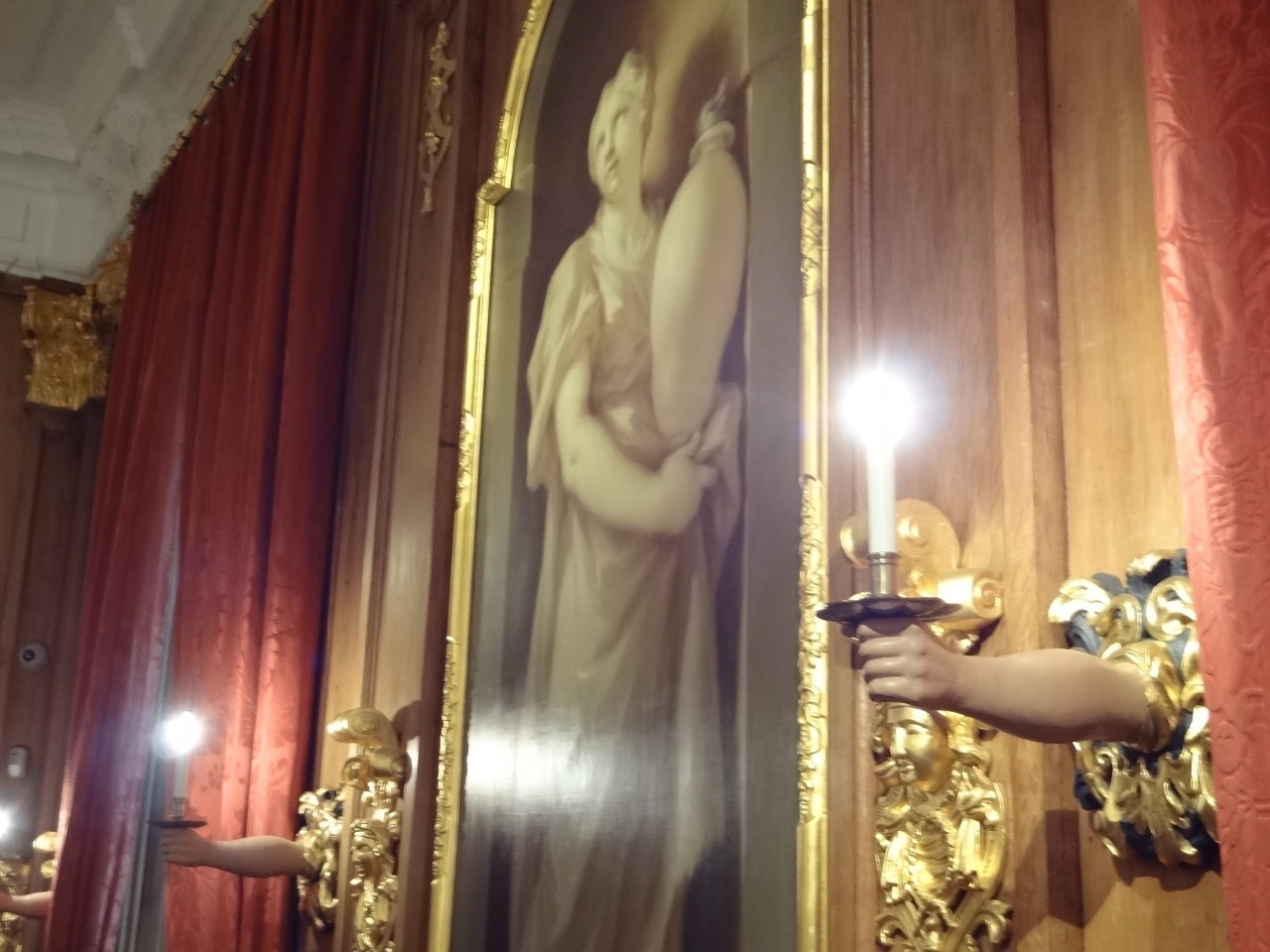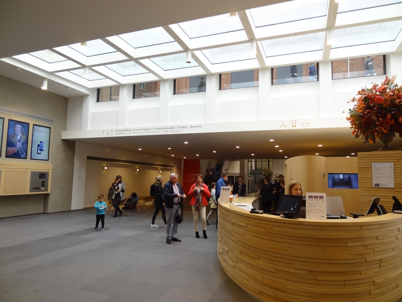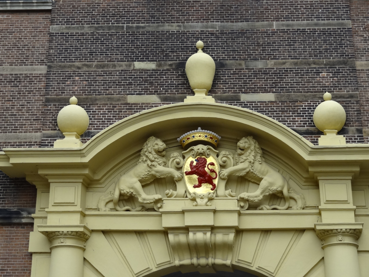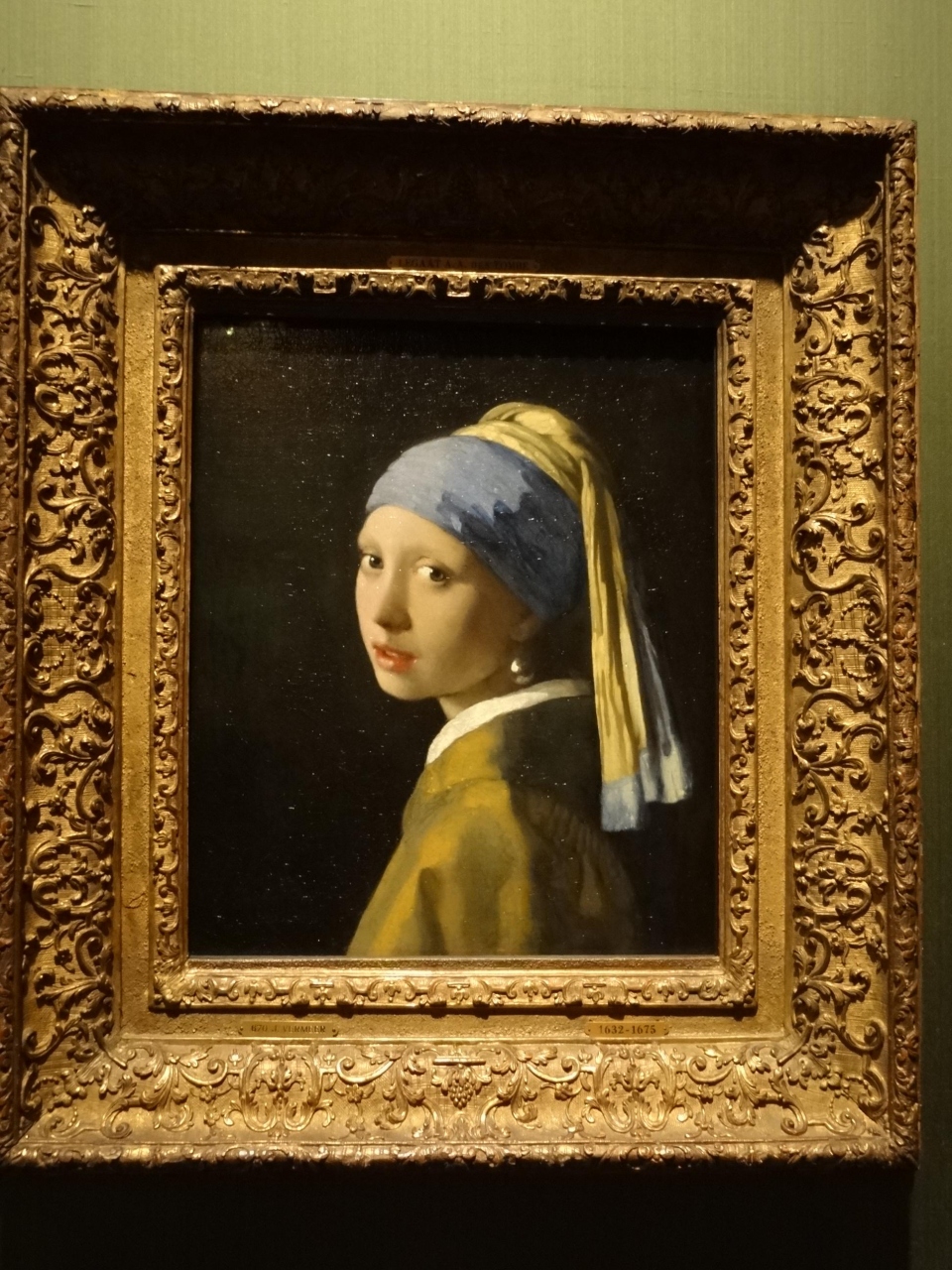 宮殿のような美術館の外には、彫像が一体立つ広場があります。広場から美術館の建物や入り口にある紋章を眺めるのもいいです。館内には日本ではあまり見かけないシースルーの円筒形のエレベーターがあり、外の景色も楽しめます。二階の大広間の壁の至る所に左腕が伸びていて、手にキャンドルを持っています。さらに、上の階にもフェルメールやレンブラントの絵画が展示されています。写真撮影も自由にできます。有名な絵画は何といっても、フェルメールの「真珠の耳飾の少女(青いターバンの少女)」。かなり近くから見られて大満足でした。「デルフトの眺望」という絵にも見入ってしまいました。