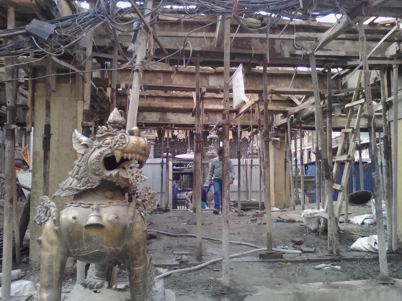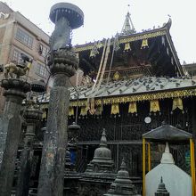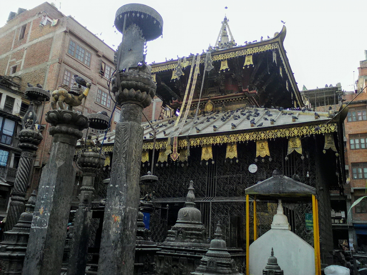 インドラチョークからアサンチョーク方向に100mほど行った左手にありますが、現在わかりにくい状況になっています。と言うのも先の地震で入口の門が崩壊してしまい完全な工事現場になってしまっているからです。注意して見ないと通り過ぎてしまいます。その工事現場を抜け中に入ると寺院が現れます。一見こちらは無傷かと思いきやよく見ると壁の彫刻がずれたり浮いたりしてしまっています。これを修復するのは大変だと思います。