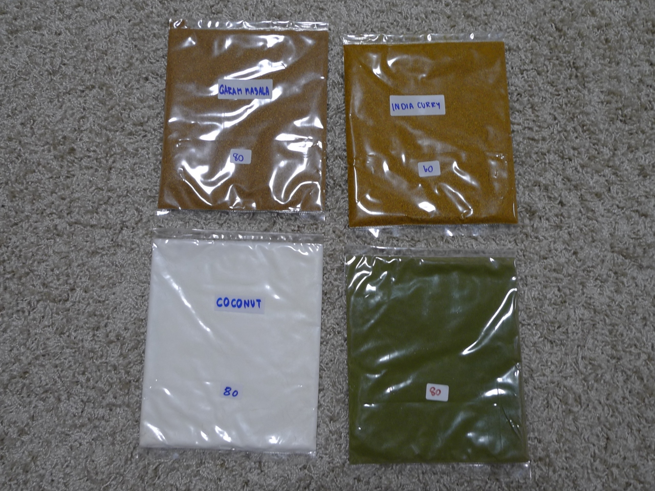 【ガラムマサラ 80B、インドカレー 60B、ココナッツ 80B、ほうれん草 80B】