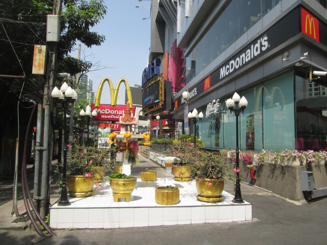 メジャー シネプレックス スクンビットのエントランスにタイらしく、献花に囲まれた金色の仏像が置かれていました。国民の90%以上が仏教徒であり、信仰深いです。買い物に来たお客さんが熱心に参拝をして、お店に入る前に合掌をしていました。