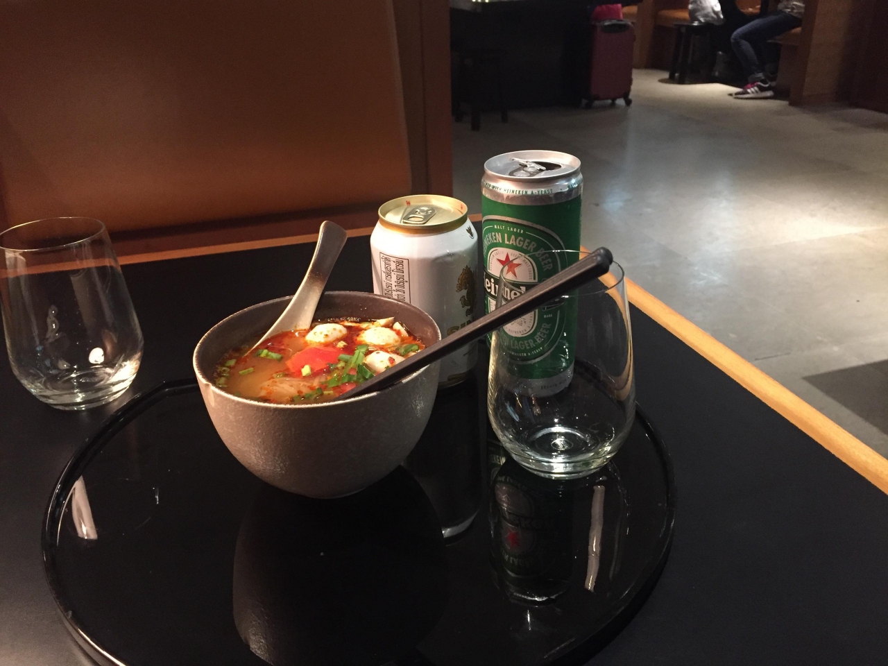 キャセイ便利用だったので、早速ラウンジへ。ここには人気のヌードルバーがあります。メニューリストを見ると、トムヤムヌードルが。たっぷりのトムヤムクンに麺が入っていて、タイの味を最後の空港で味わえるとは。他方、バーカウンターどは、バーテンが常駐していて、シャンパンを始め、カクテルも作ってくれます。至れりつくせりで、ラウンジも広くて快適。満喫させてもらいました。