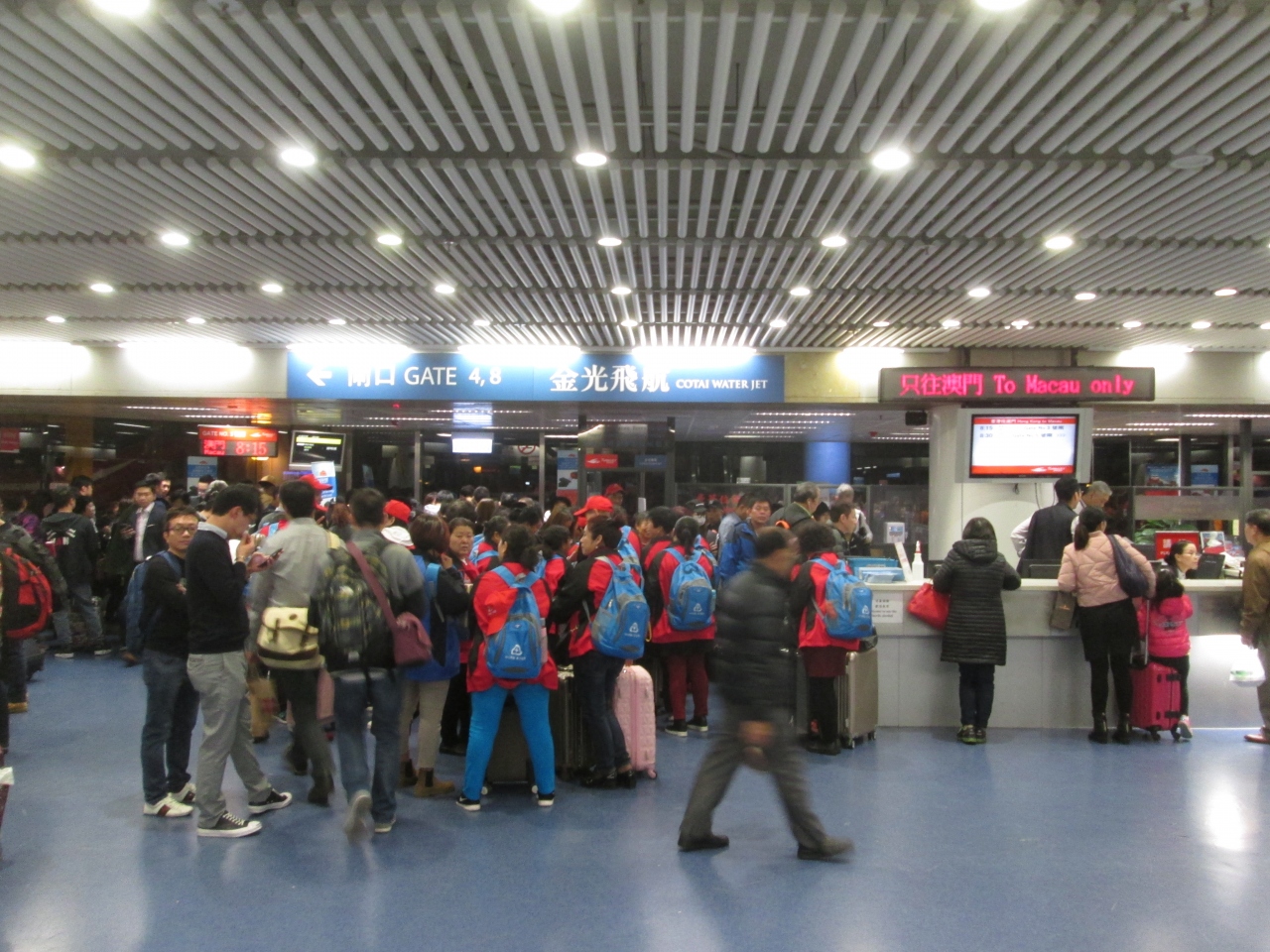金曜日の夜、マカオ方面行きのターボジェットを利用しようと上環フェリーターミナルに訪問すると、週末、マカオで過ごすと思われる中国人の団体客がいて、ごった返していました。フェリーのチケットは購入できましたが、希望する時刻の1時間後とかなり待たされました。