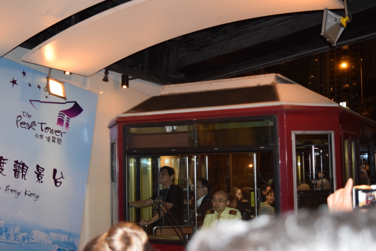 ビクトリアピークからの夜景観賞のため、乗車。ツアーの優先搭乗により、18:30に着いて30~40分の待ちで乗車できました。一般だと3~5時間待ちだそうで、ツアーで行くのが正解。