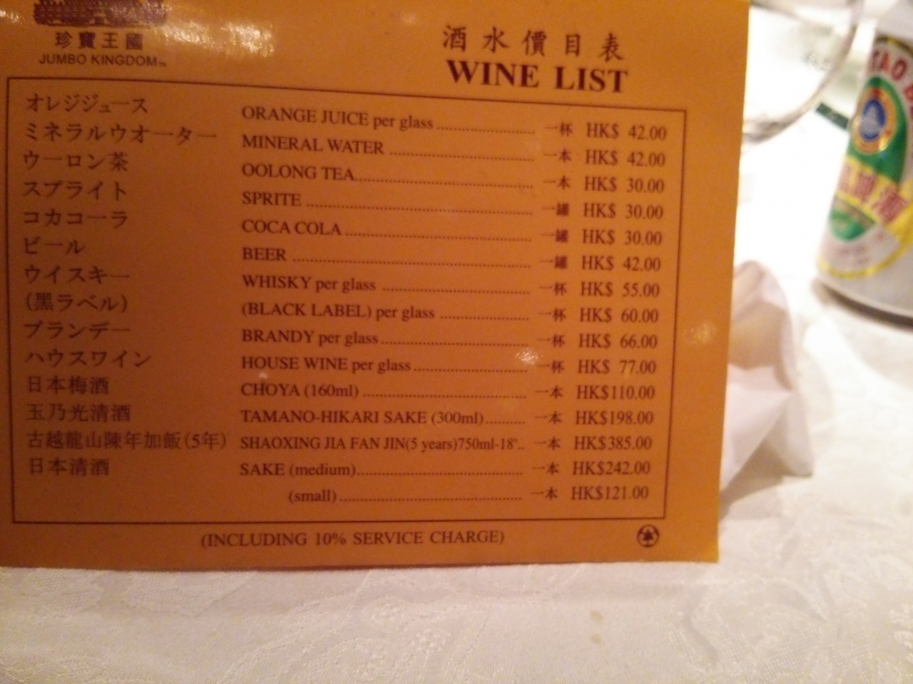 料理も意外に味は悪くなく、普通に食べられます。ここは景観と雰囲気を楽しむ場所と割りきれば全然okなレベル。ただ、ビールは街中と比べると高い。コンビニで10ドルくらいで買える缶ビールが42ドル。といっても日本円で600円くらいですから、観光地レストランであれば許容範囲かな。香港はビールが安いので、高く感じてしまいます。