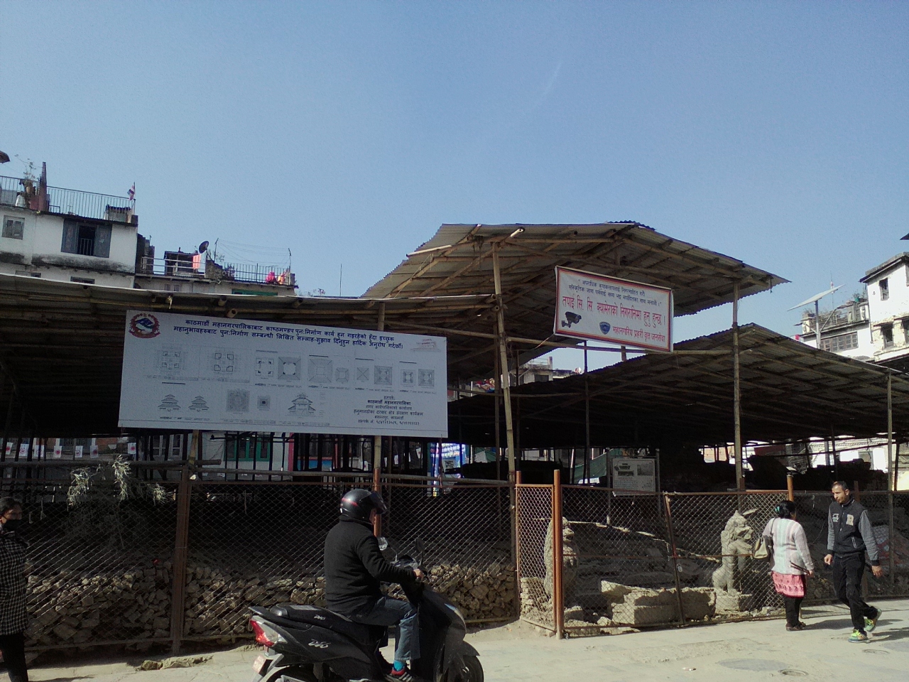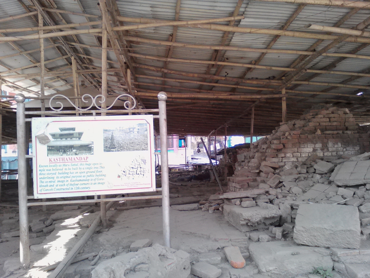 2015年の地震で倒壊してしまいました。一本の大木から造られたという伝説を持ち、ネパール最古の建築物の一つと言われ歴史的な価値も大きかっただけに実に惜しまれます。現在は仮設の屋根が設けられているので再建作業が始まっているのかもしれません。材料となる貴重な瓦礫が一部残されたままので柵で囲まれ立入禁止になっています。
