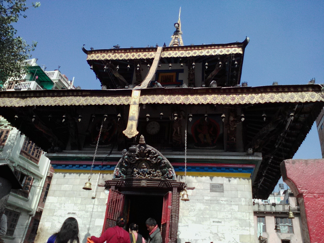 インドラチョーク側からダルバール広場に入ると右手にある最初の寺院です。上部はネワール様式の伝統的な造りですが下部の精巧に積まれた白い石材のせいでどこか現代的な印象を受けます。近付いて眺めても2015年の地震の影響はほとんど感じられませんでした。入口の門前には“お参りセット”を売るおばちゃん達が並んでおりなかなか活気のある寺院です。