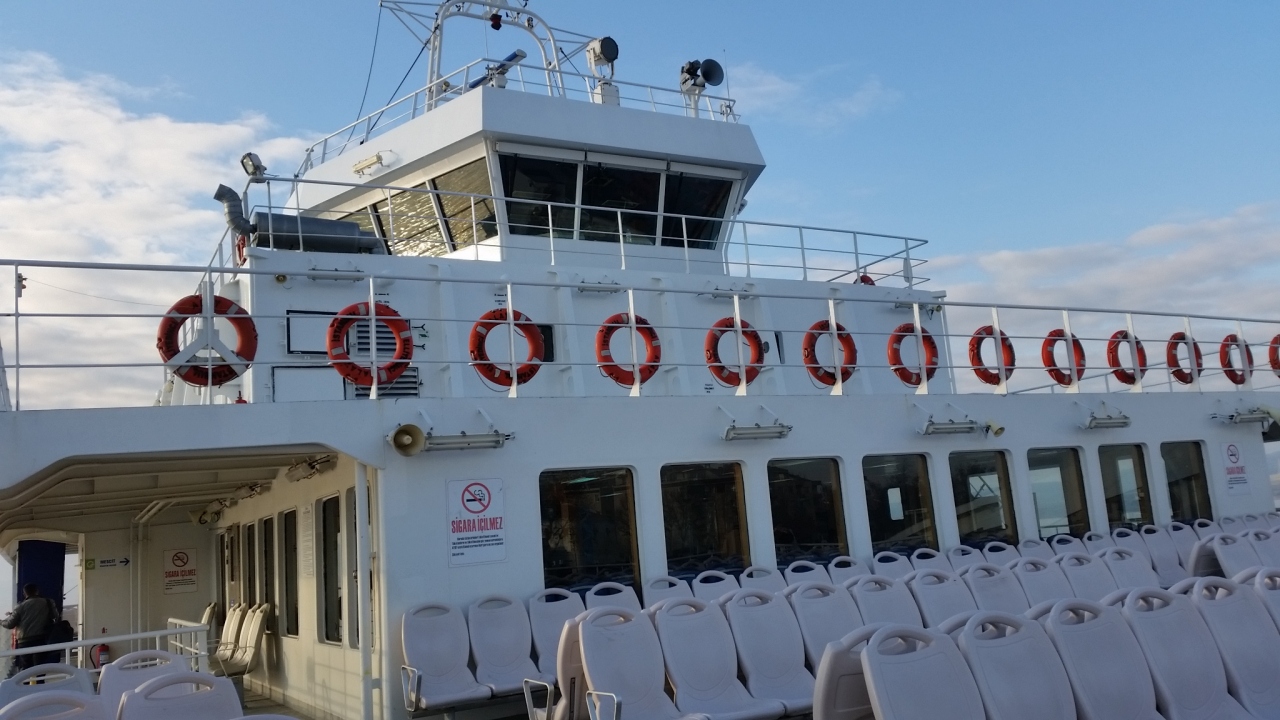 ツアーで訪問しました。トロイ遺跡を見るために、イスタンブールからチャヌッカレへ向かいます。観光バスに乗ったままフェリーに乗り込みました。天気は良く、風もなく、穏やかな天気で、全く船は揺れませんでした。船内でチャイを飲む方もいました。