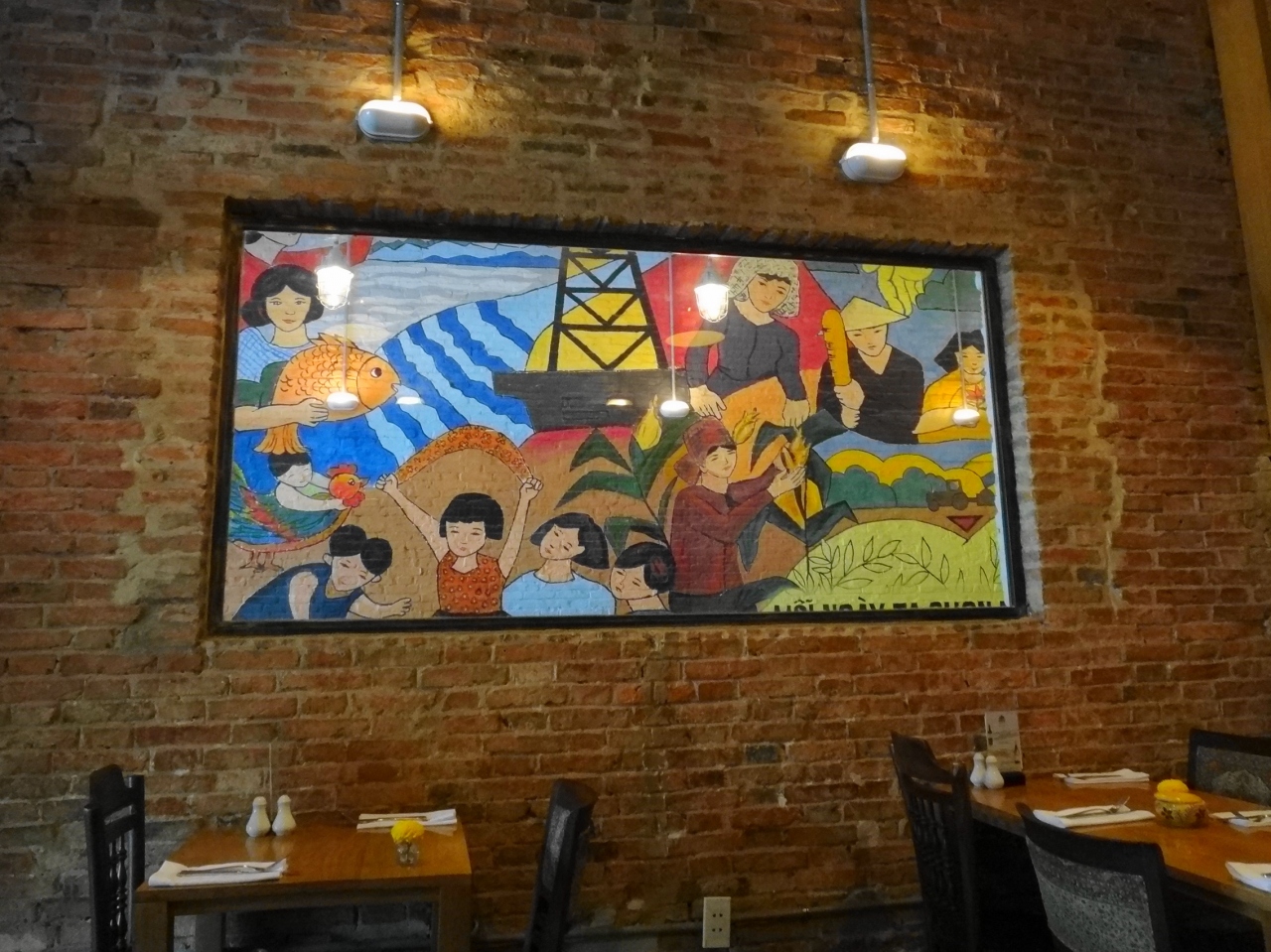 古びたレンガをくりぬいた窓から、となりのカフェの壁画を見せている、