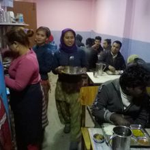 タヒティチョーク周辺は安めし屋の宝庫。他にもそういう場所はたくさんあると思いますがタメルから近いぶん、節約旅行者には利用価値大です。私のお気に入りのうちの一つをご紹介したいと思います。ストゥーパの前の道をチェトラパティ方向へ50mほど行った右手にある食堂です。名前は「プラダン・ボジャナラヤ」。一応看板は出ていますがネパール語です。わからなければ人に聞くか写真を参考にして下さい。ダルバートが食べられます。メニューはベジ、チキン、バフ(水牛)のみ。どれかを言えば運ばれてきます。内容はライス、ダル、サブジ(1種か2種)、アチャール、そしてチキンかバフ。シンプルが故にこれがうまい!ちょっといいレストランは油ギトギトですがここのはさらさらいくらでも食べられます。で驚きなのが値段。ベジが100Rs、チキン,バフが150Rsです。なんと肉以外はおかわり自由の食べ放題。やっぱおすすめはチキンです。毎日通える店です。