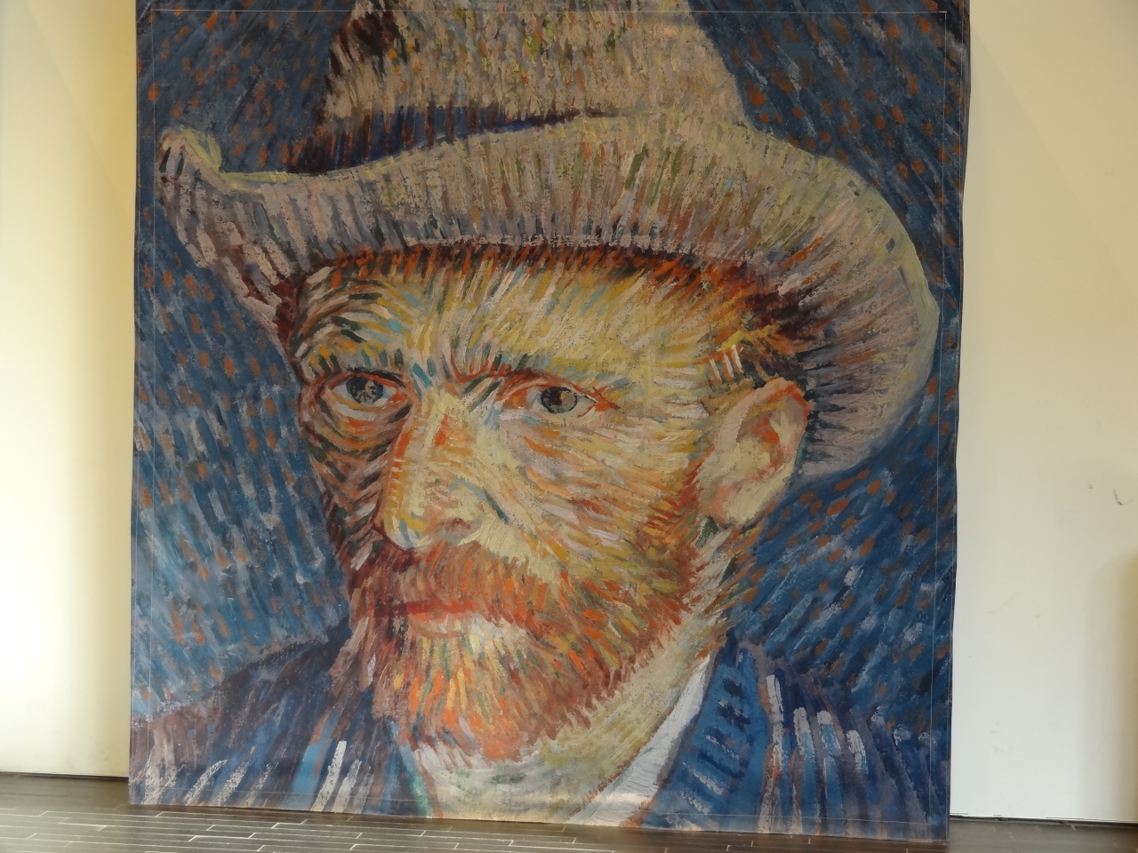 長年の念願がかなってゴッホ美術館に入館しました。美術館の隣にはゴッホの絵に関連したグッズを販売する露店があります。どこへ行っても商魂たくましいと思いました。館内で展示されている作品を撮影することは禁止されています。撮影できない分、しっかり絵画を目に焼き付けるようになりますから、じっくり絵画を観賞できます。本物のひまわりの絵の前では人だかりができていて、さすが人気があります。ひまわりを見ていると、ググッと引き込まれるような感じになるのが不思議です。他にもゴッホの絵画がいっぱい展示されていますから、しっかり見ていくと最低でも一時間はかかります。一階にはお土産ショップが二箇所あります。右側のショップの前にある、複製のひまわりの絵やゴッホの肖像画は撮影できます。ひまわりの絵の横に立って記念写真を撮るのもおススメです。複製のひまわりは直に手で触れることもできます。目の不自由な人にも楽しめるようになっています。二店舗あるお土産ショップでゴッホ関連グッズを見ながら、数点のお土産まで購入してしまいました。