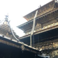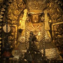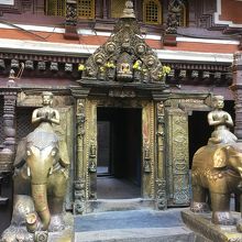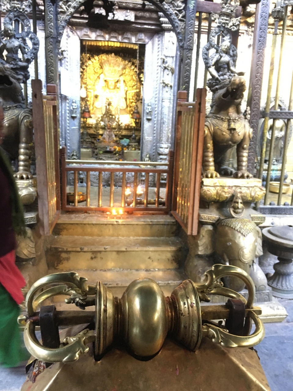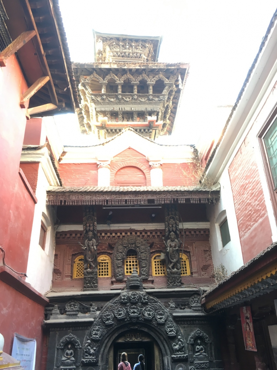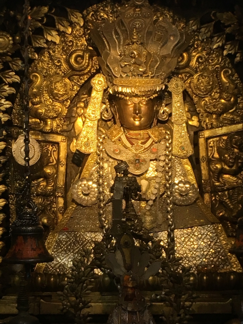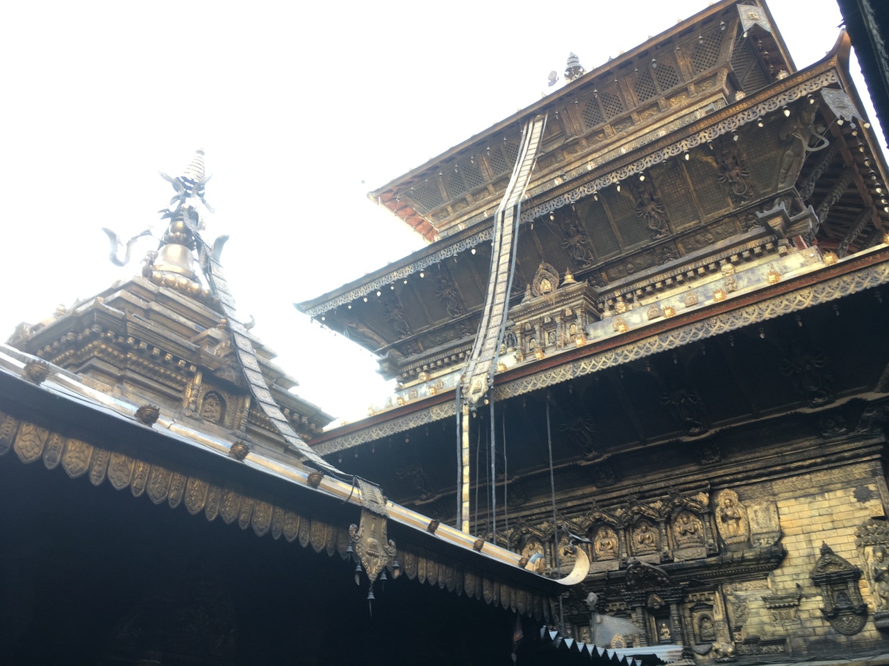 12世紀に建造された、この寺院は金箔で覆われた本堂を持つことから「ゴールデン・テンプル・黄金寺」と呼ばれています。正式には「ヒラニャ・ヴァルナ・マハビハール」という舌を噛みそうな長ったらしい名称です。入口が狭い路地に面していて、外観はかなり地味めですが、一歩門をくぐり、中には入ると豪華絢爛な別世界が待っていて、そのギャップが印象的です。入口部分、門の天井に天井に嵌め込まれ曼荼羅は12世紀につくられたネパール最古の石の曼荼羅だそうです。塔の屋根から垂らされた帯は「ドバジャ」と呼ばれるもので、神仏が地上に降り立たれるときの道なのだそうです。因みにこの寺院は、何故か、革靴での入場、皮バッグ持ち込みが禁止になっています。革靴の人は入口にサンダルがあるので、それに履き替えて入ってください。どうして、皮がNGなのかは、たぶん、ヒンドゥー教は牛を神聖な動物としていて、食べてはならないことが理由ではないかと思いますが、そもそも、この寺院はヒンズー教のお寺なのか、チベット仏教の寺院なのか、どちらなのか、よくわかりません。