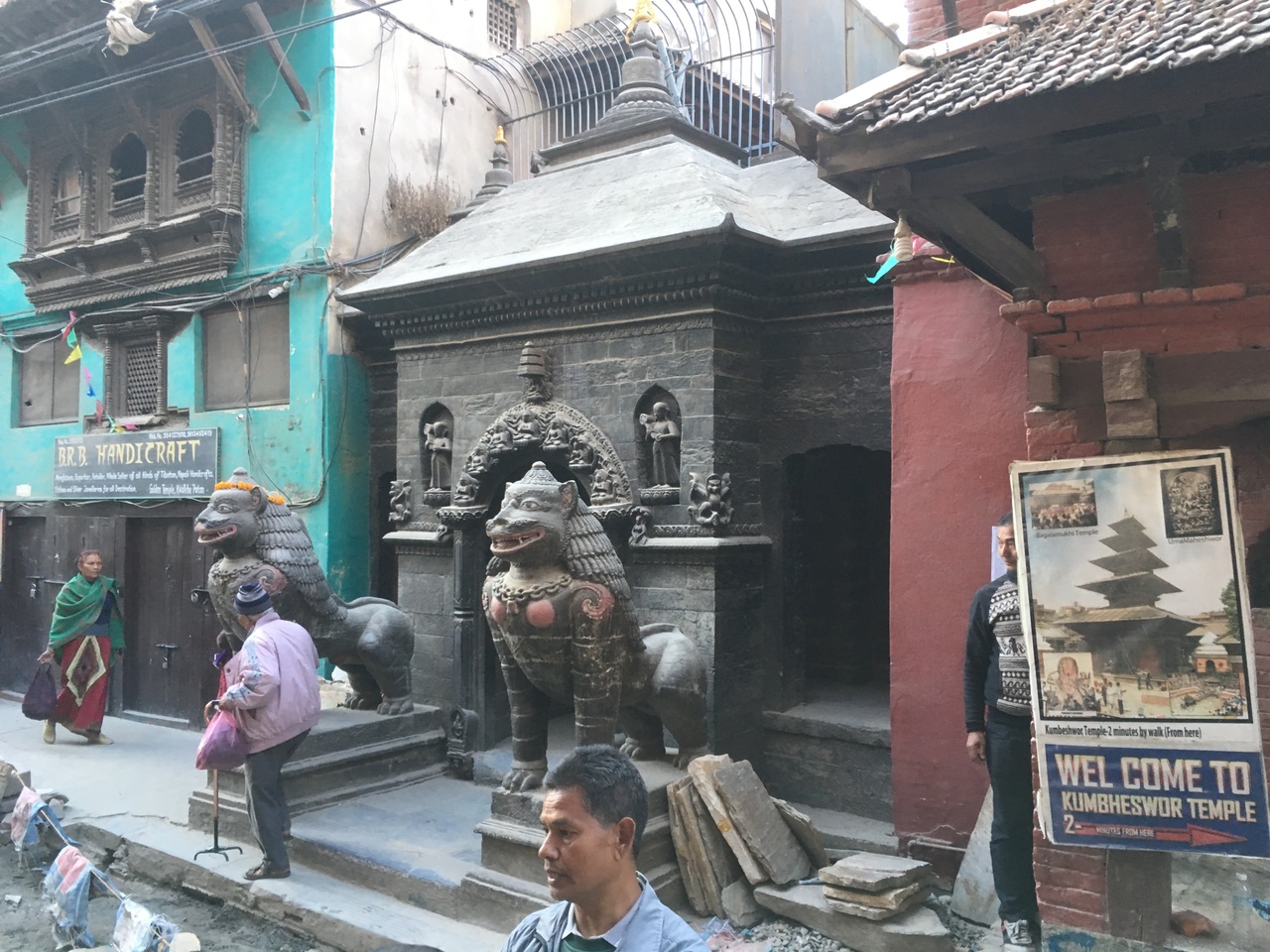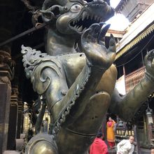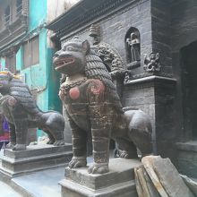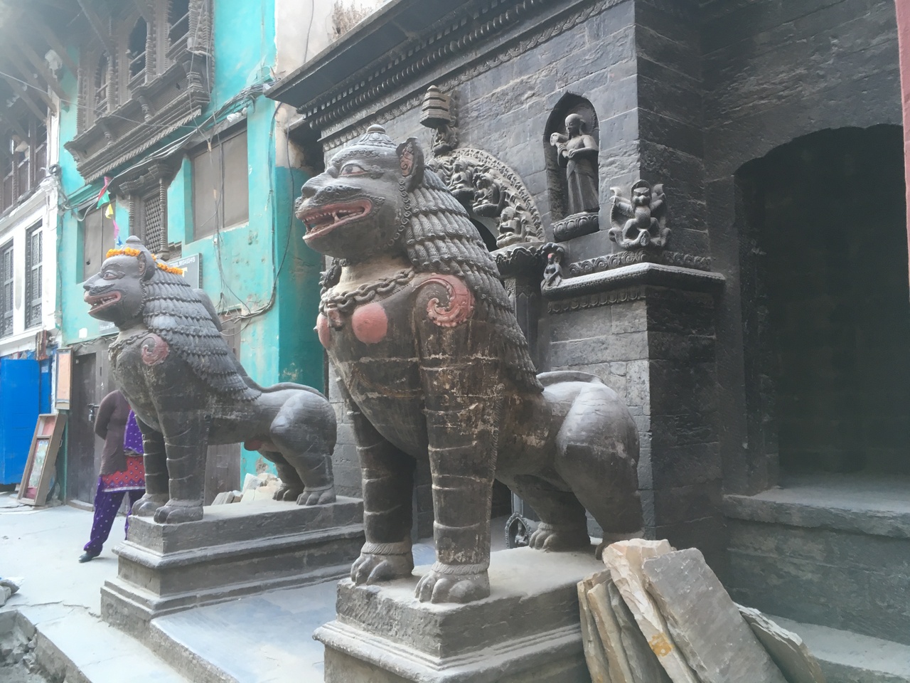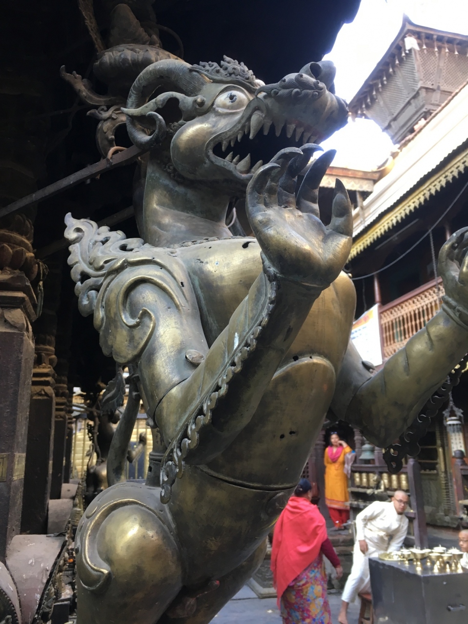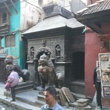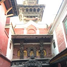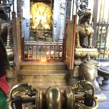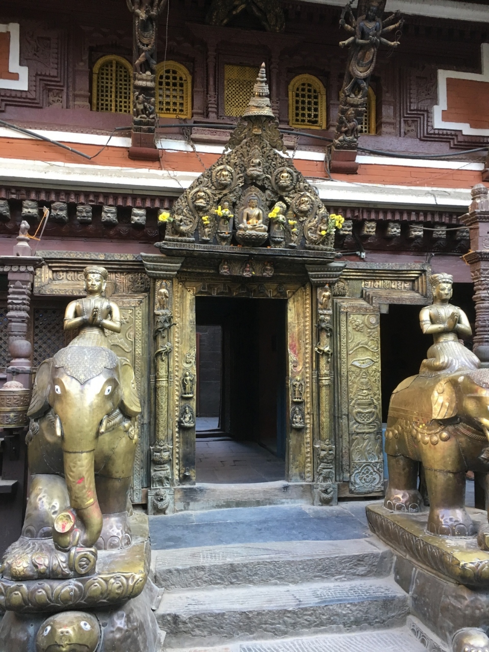 12世紀に建造された、この寺院は金箔で覆われた本堂を持つことから「ゴールデン・テンプル・黄金寺」と呼ばれています。正式には「ヒラニャ・ヴァルナ・マハビハール」という舌を噛みそうな長ったらしい名称です。入口が狭い路地に面していて、外観はかなり地味めですが、一歩門をくぐり、中には入ると豪華絢爛な別世界が待っていて、そのギャップが印象的です。入口部分、門の天井に天井に嵌め込まれ曼荼羅は12世紀につくられたネパール最古の石の曼荼羅だそうです。塔の屋根から垂らされた帯は「ドバジャ」と呼ばれるもので、神仏が地上に降り立たれるときの道なのだそうです。因みにこの寺院は、何故か、革靴での入場、皮バッグ持ち込みが禁止になっています。革靴の人は入口にサンダルがあるので、それに履き替えて入ってください。どうして、皮がNGなのかは、たぶん、ヒンドゥー教は牛を神聖な動物としていて、食べてはならないことが理由ではないかと思いますが、そもそも、この寺院はヒンズー教のお寺なのか、チベット仏教の寺院なのか、どちらなのか、よくわかりません。