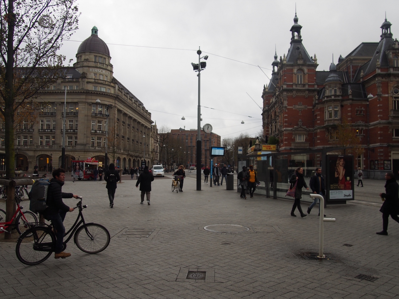 ラィツエ通りの市立劇場前の広場です。すぐ目の前にはシンゲル運河、運河を渡ると国立美術館があります。名称は広場になっていますが、道路の交差路が広くなったという感じで、トラムも走っている交通量の多い道です。ただ広場の周りにはカフェ、レストランなども多くあるので、美術館帰りなどで立ち寄り利用しやすいです。