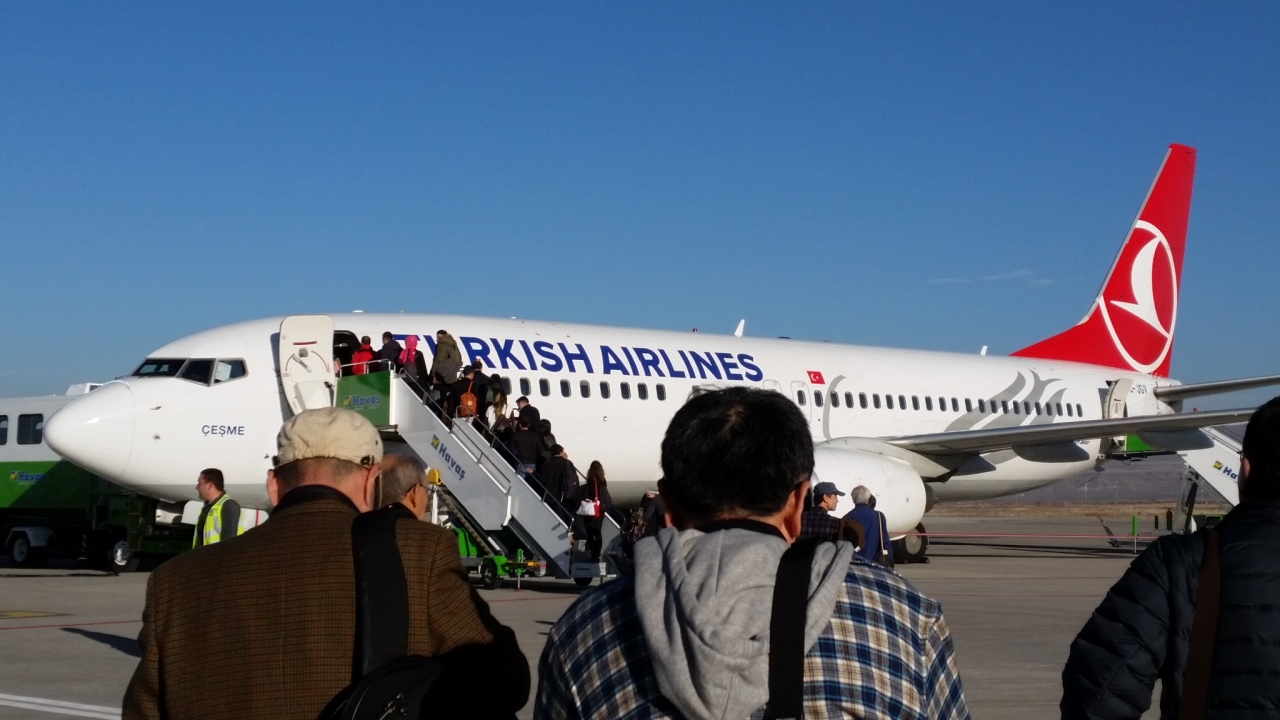 ツアーで、ここからイスタンブール空港まで、トルコ航空で飛びました。小さな空港で、何キロまで荷物を預けられるのか、良く分からず、とりあえず22kgにしましたが、何も言わず受け付けてくれました。搭乗口を出てから、外に出て、歩いて移動し、飛行機に乗りました。