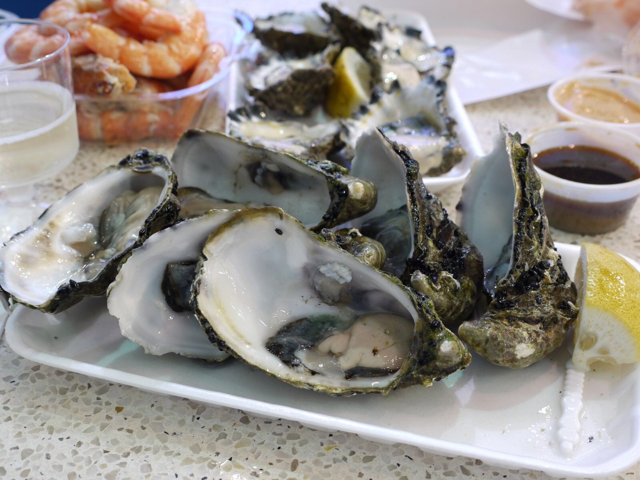 牡蠣やエビなど、新鮮な魚介類を購入して食べることができる、とても楽しい場所です。オーストラリアは公の場での飲酒は禁止されているそうですが、マーケット内に酒屋があり、そこでワインを買うと紙袋に入れてくれるので、その状態であればOKなようです。