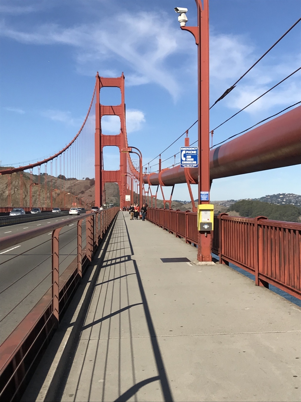 思っていたより長くてびっくり。フィッシャーマンズワーフ方面から、サウサリートまで、サイクリングをした際に横断しました。橋は、車道と歩道が別になっていて、歩道側に人と自転車が通れるようになっています。ところどころ、立ち止まって、景色を眺めたり、写真を撮ったりできるように広くなっています。