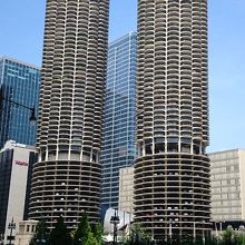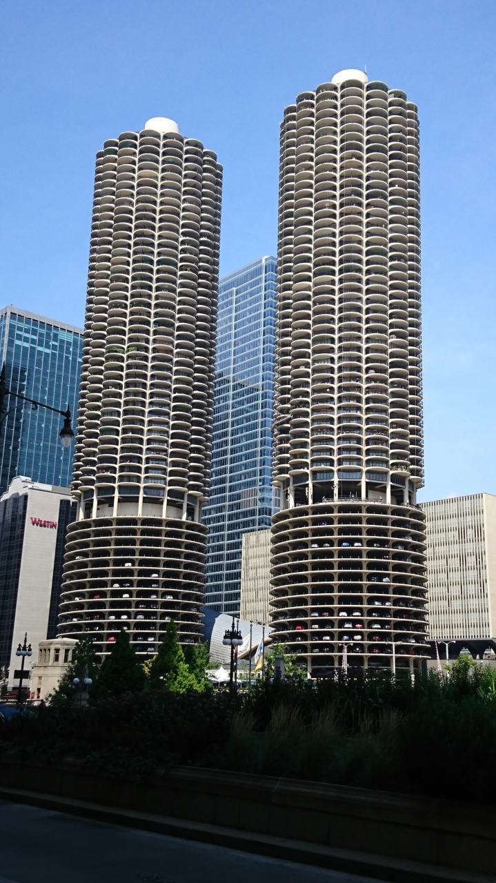 コーンタワーと言うと日本では、新宿西口の東京モード学園のビルが有名ですが、こちらのコーンタワーは1964年に完成した建物なので、歴史があります。第二次世界大戦後初めて建てられたという高層ビルの高さは179メートル、下層階には900台の駐車場、上層階には900世帯が入る住居があります。マリーナシティの5つの建物の中のうちの住宅棟で、「コーン・タワー」「コーン・コブ」の愛称があります。都心部を流れるシカゴ川沿いにあるビルは、様々な高層ビルが建ち並ぶシカゴの中でもひときわ目立つ存在であり、シンボルでもあります。タワーの足元にはマリーナが設けられているとのことです。