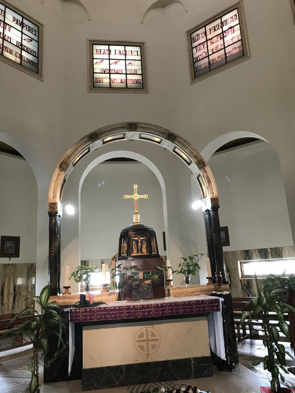 天井に聖書のその8つの幸いが書いてあり、教会までの通路にも実はサイドに置いてある石に1つずつ書いてある