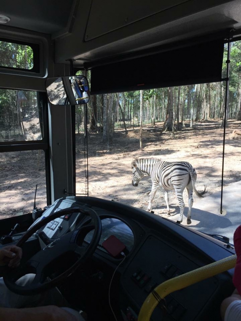 サファリパークは無料のバスに乗って進みます。バスの中は冷房がきいていてとても涼しいです。